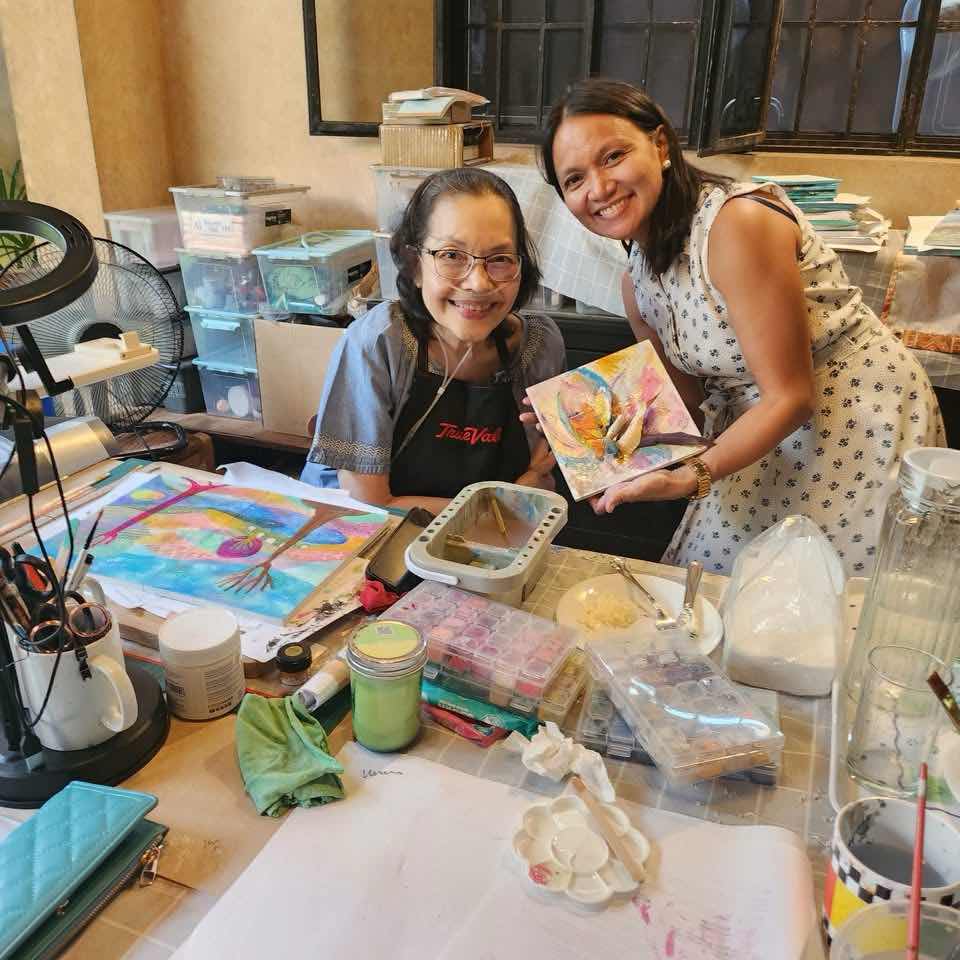 Here’s what she and up with, a mixed media piece using acrylics, oils, watercolors, mica powder, papers from my collage stash and leaves from the garden. What fun!