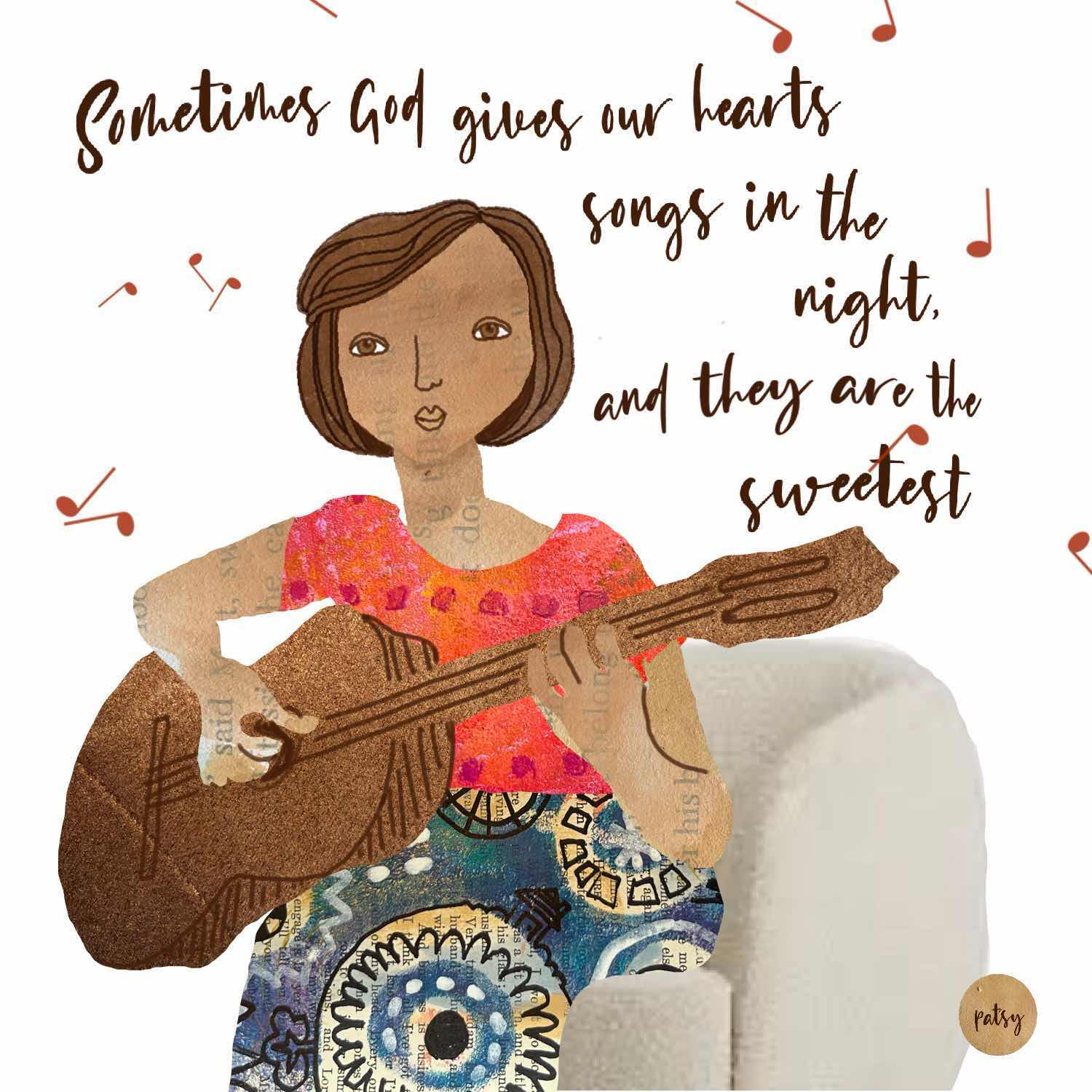 In the book, “Streams in the Desert”, I read of a legend about a German baron who stretched wires from tower to tower at his castle on the Rhine. He wanted the winds to convert them into an aeolian harp. As the soft breezes blew about the castle, no music was heard. But one night, a great storm broke and the baron’s castle was smite by the fury of the winds. As the tempest raged on, music from the aeolian harp filled the air. Sometimes God gives our hearts songs in the night and they are the sweetest songs we will ever sing, and the most beautiful God will hear.